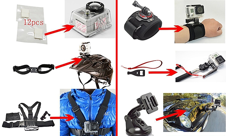 Telescopic Pole, Flat Adhesive Pads, Bag, J-Hook Buckle Mount, Handlebar Mount,Curved Adhesive Pads, Screws, Wrench Spanner Tool, Chest Harness, 3-way Adjustable Pivot Arms, 12 Anti-Fog Insert, Head Straps, Helmet Mount, Safety Buckle Tethers, wrist Straps, Hand Grip, 360′ Rotary Backpack, Bicycle Stand, Helmet Extension Arms, 360 Degree Rotation Hand Wrist Strap, Suction Cup Mount, Case,Lens Cap Cover |